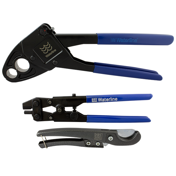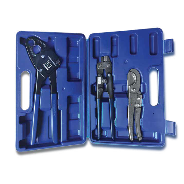 | 1592328 | 1/2″ & 3/4″ angle crimp tool (1592310) with ring remover tool (1590099), and PEX Cutter (1378701) in a tool storage case. / Outil de sertissage angle de 1/2 po et 3/4 po avec retrait de bague (1590099) et coupe tuyau PEX (1378701) |