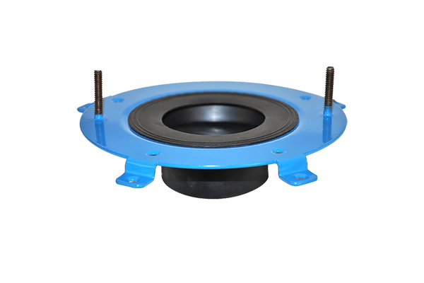 – Steel toilet flange with attached closet bolts and deep rubber drain funnel